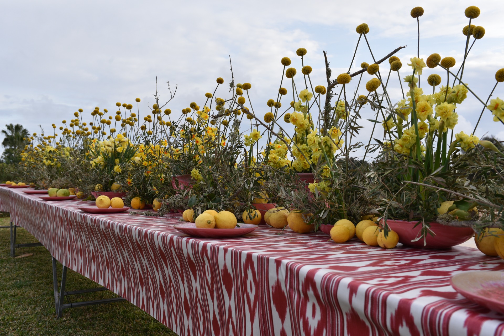 Durante el workshop trabajamos con la cerámica Ca Na Mel, una marca familiar mallorquina con historia que se remonta a los años 40 del siglo XX. No se trata de vajilla decorativa común. Las colecciones Verde Mar, Limones y Aires de Mar tienen una identidad visual clara y reaccionan directamente al entorno mediterráneo. La cerámica no fue solo una base para los arreglos, sino que se convirtió en parte de la composición, de sus colores y de la impresión final. Gracias a ello, los trabajos resultantes funcionaron como conjuntos estilizados completos, no solo como objetos florales aislados.